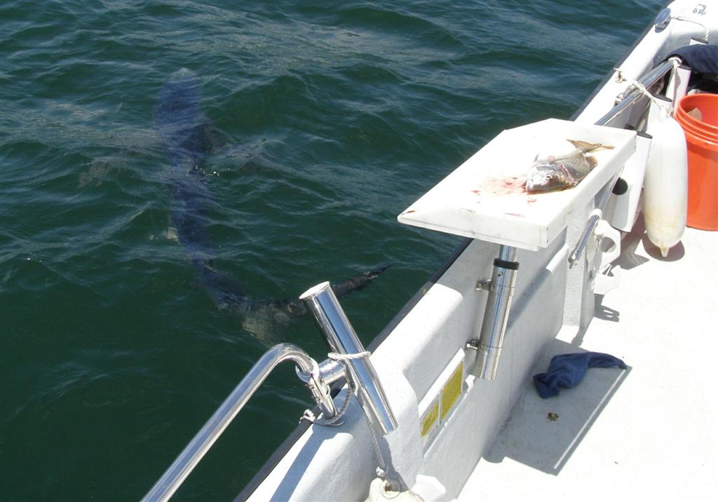 A five foot blue shark hung around Bob Chew’s boat early this Monday as he cleaned scup just south of the Newport Bridge.